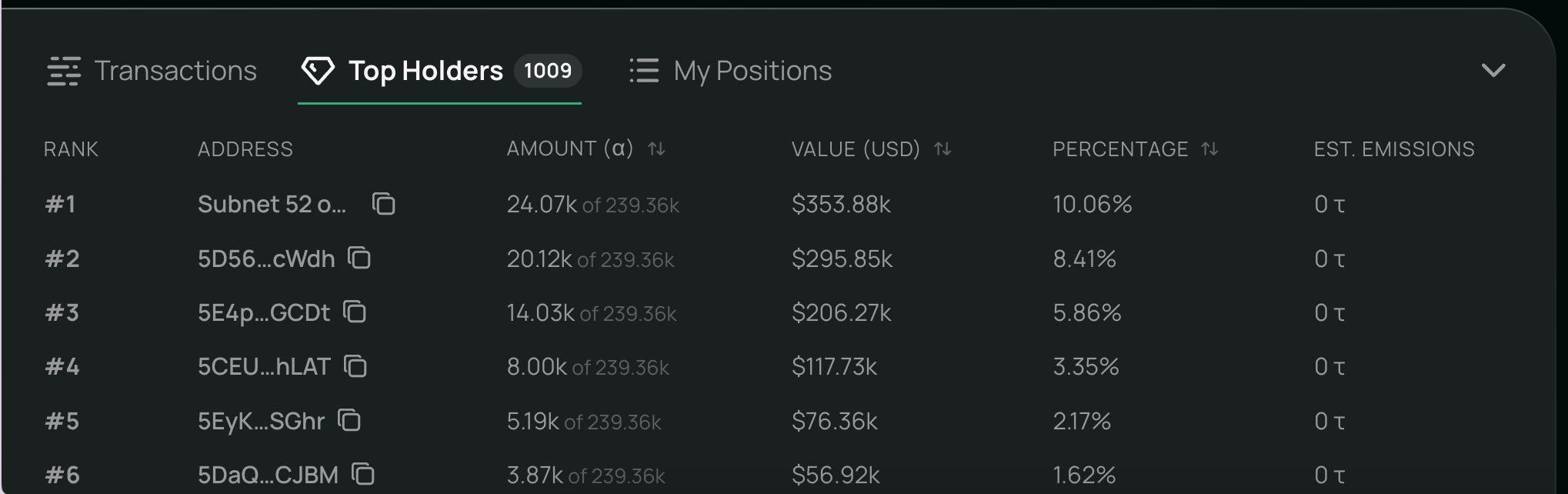 View your dTAO positions across all subnets at a glance, including your current stake and emission rate of the held dTAO.